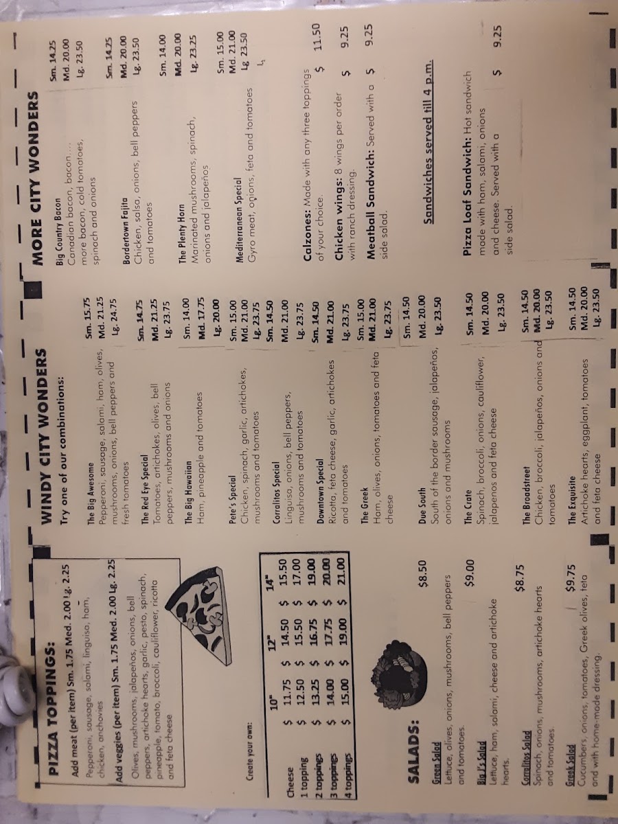 You’ll find a range of satisfying options from freshly baked pizzas—such as the local specialty and Greek Salad—to hand-tossed calzones and simple pasta dishes like rigatoni and cheese ravioli. The menu also includes unique sandwiches like the Pizza Loaf Sandwich, alongside crowd-pleasing sides and refreshing sodas, making it easy to create a meal that fits your mood and appetite.